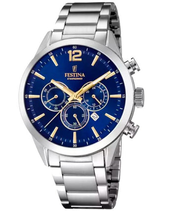 Orologio Festina da uomo, cassa in acciaio inossidabile con un diametro di 43,5 mm, quadrante blu, vetro minerale. Meccanismo al quarzo con funzione di orario, datario e cronografo. Bracciale in acciaio inossidabile. Resistenza all'acqua 5 bar.