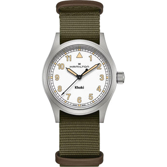 Il Khaki Field Quartz di Hamilton è l'orologio ideale per chi cerca uno stile semplice ma resistente, ispirato alla tradizione militare. Il quadrante bianco accoglie numeri arabi ben visibili e una minuteria precisa, il tutto sottolineato da un'elegante palette cromatica e da indici in Super-LumiNova® color rodio anticato. Con il suo cinturino NATO verde e passanti in pelle marrone, è pronto ad accompagnarti in ogni avventura all'aria aperta.