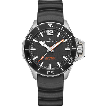 Orologio Hamilton Khaki Navy Frogman, cassa in acciaio inossidabile con un diametro di 46mm, il vetro è in zaffiro antigraffio con trattamento antiriflesso, quadrante di colore nero con indici. Il meccanismo è meccanico a tre sfere con data e riserva di carica superiore di 80 ore, l'H-10 presenta elaborati motivi colimaçon e perlati a contrasto per i modelli American Classic e superfici pulite per gli orologi da pilota. Resistenza all'acqua di 30 bar.