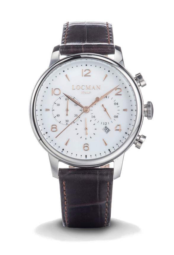 Orologio Locman della collezione 1960, quadrante bianco con numeri arabi colore oro rosa, vetro minerale con trattamento zaffiro. Meccanismo al quarzo con funzione di tempo, datario e cronografo. Cinturino in pelle testa di moro. Resistenza all' acqua 5 bar.