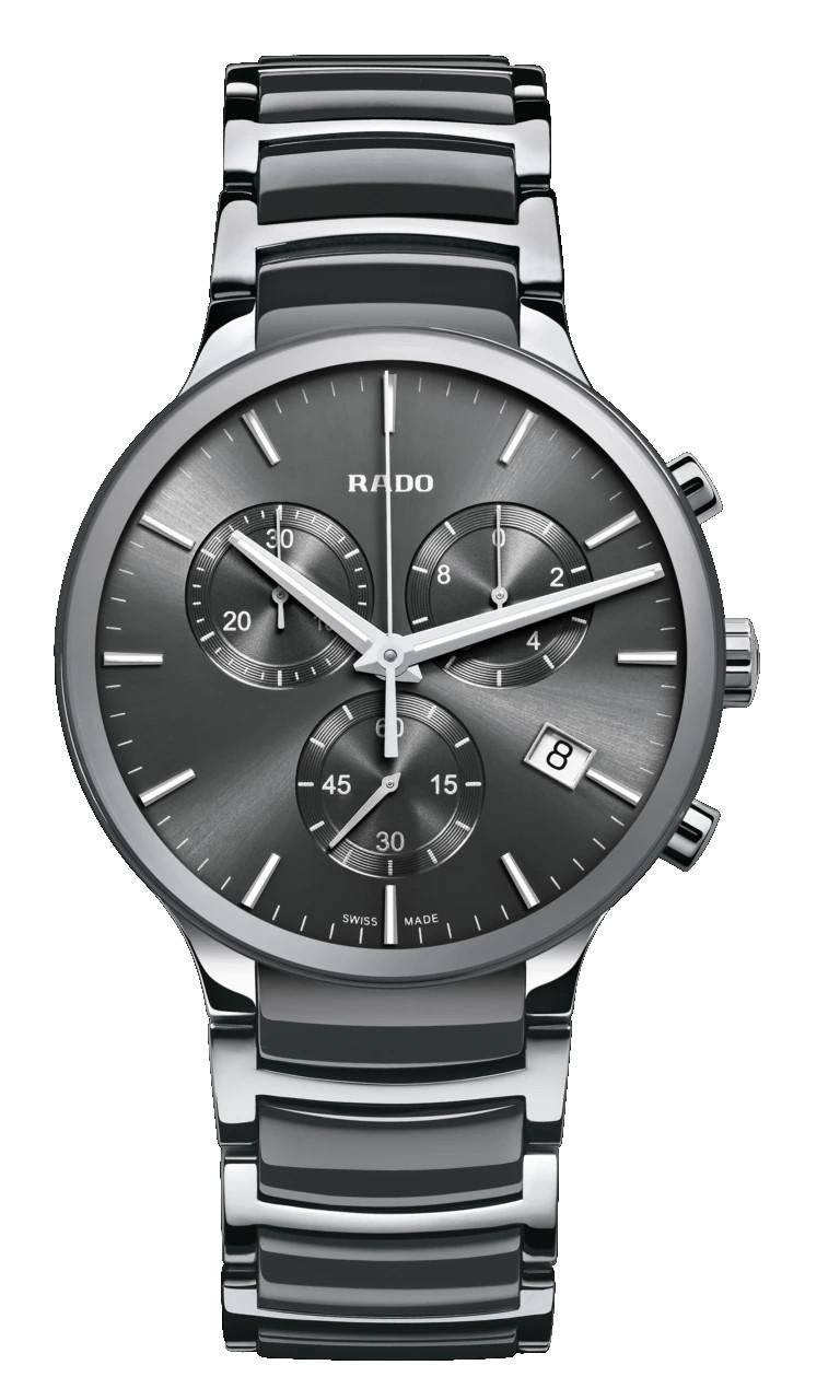 Orologio Rado Centrix Chronograph, cassa di forma rotonda con un diametro di 40 mm, quadrante di colore nero con indici applicati. Il meccanismo è al quarzo Swiss Made con funzione di tempo, datario e cronografo. La resistenza all'acqua è di 5 bar. Il bracciale è realizzato con ceramica hi-tech al plasma, Acciaio e titanio.