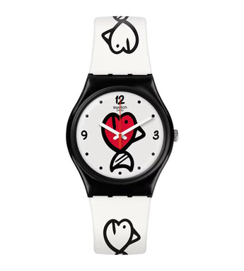 FISHY FISHY (GB321) è un orologio elegante e originale che si distingue per il cinturino e il quadrante decorati con pesci bianchi e neri e un pesce rosso. La cassa e la fibbia nere creano un contrasto elegante, mentre il passante rosso aggiunge un tocco di colore.