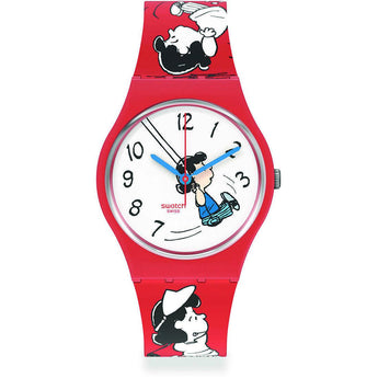 In questo Swatch X Peanuts di Lucy Van Pelt, il robusto cinturino in silicone rosso opaco e la cassa in materiale biologico generano un forte contrasto con la stampa completa in bianco e nero di Lucy sul cinturino. Il robusto passante in silicone blu opaco stampato e la fibbia in plastica sempre in blu opaco aggiungono il tocco finale che rende straordinario questo orologio dei Peanuts.