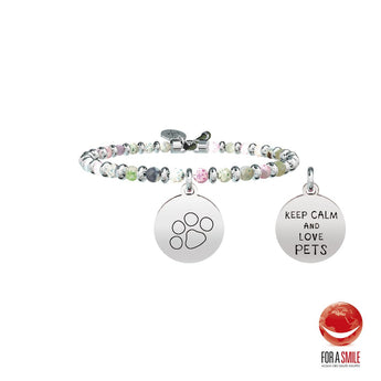 KEEP CALM AND LOVE PETSBangle con filo armonico in acciaio, sfere in agata multicolor e ciondolo tondo. • Incisione smaltata sul ciondolo • Chiusura con cordino • Misura regolabile, diametro da 5,5 a 6,5 cm • Materiale: Acciaio 316L, Agata • Designed by Kidult in Italy