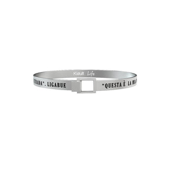 "Questa è la mia vita, se ho bisogno te lo dico, sono io che guido o che vado fuori strada". LigabueLigabue Official Collection Bangle in acciaio satinato. • Incisione smaltata • Chiusura quadrata • Misura Standard, diametri 6,5 cm x 5,2 cm • Materiale: Acciaio 316L • Designed by Kidult in Italy • Testo e Musica di Luciano Ligabue. © 2002 by Warner Chappell Music Italiana s.r.l. / Fuoritempo S.r.l.
